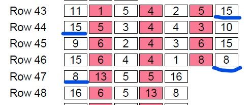 Why do I mention this? (SEE CLIP OF PATTERN BELOW) One of my testers that did the test project for me thought when she had completed row 43 with 15 white blocks that she needed to start row 44 with 10 white (from the right hand side) of the next row. All of my patterns are printed so that each line is read like a book. so you do row 43 and end with 15 white, flip your work and then start row 44 with 15 white. You can see that the amount is not always the same at the end of one row and beginning of the next. Don't worry, that is just different as it is an area of the design. So the rows end and beginnings don't always line up. It doesn't mean something is wrong with the pattern, It means the design area is changing.